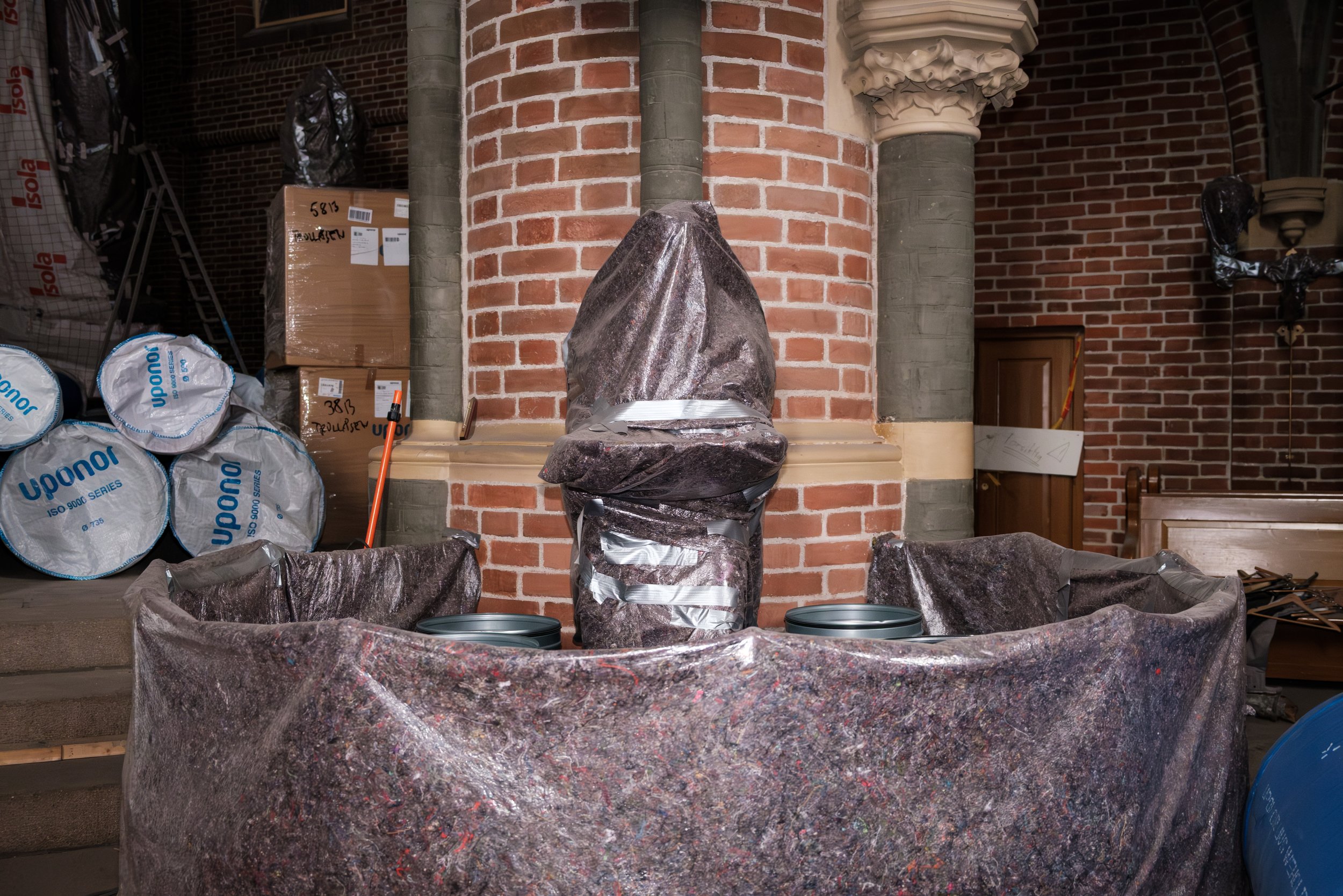 Nå er orgelet, lysekronen, altertavlen og døpefonten pakket inn i plast.